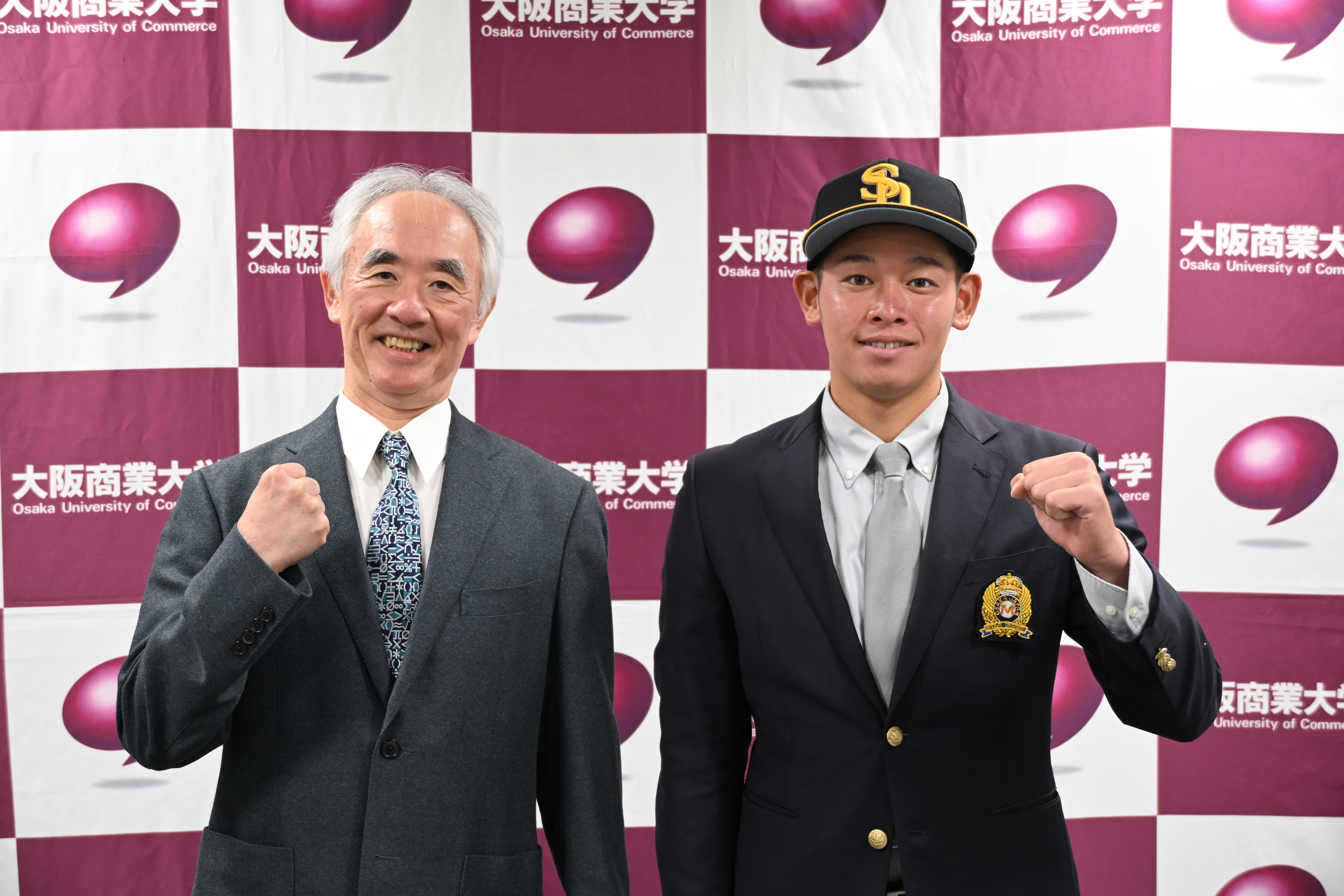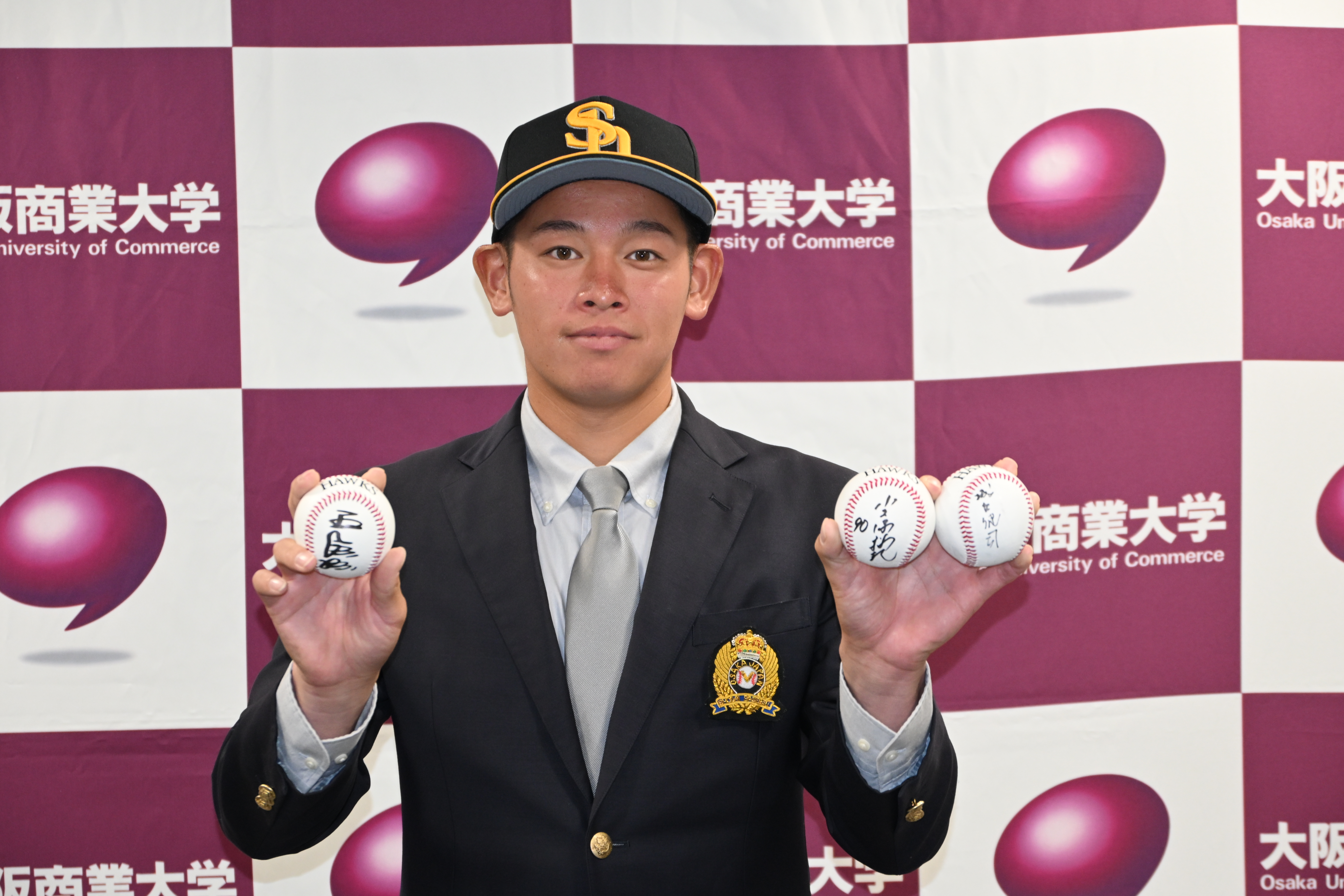 10/29(水)、本学にて、福岡ソフトバンクホークスからドラフト3位指名を受けた硬式野球部の鈴木豪太投手(公共4)が、球団より指名挨拶を受けました。