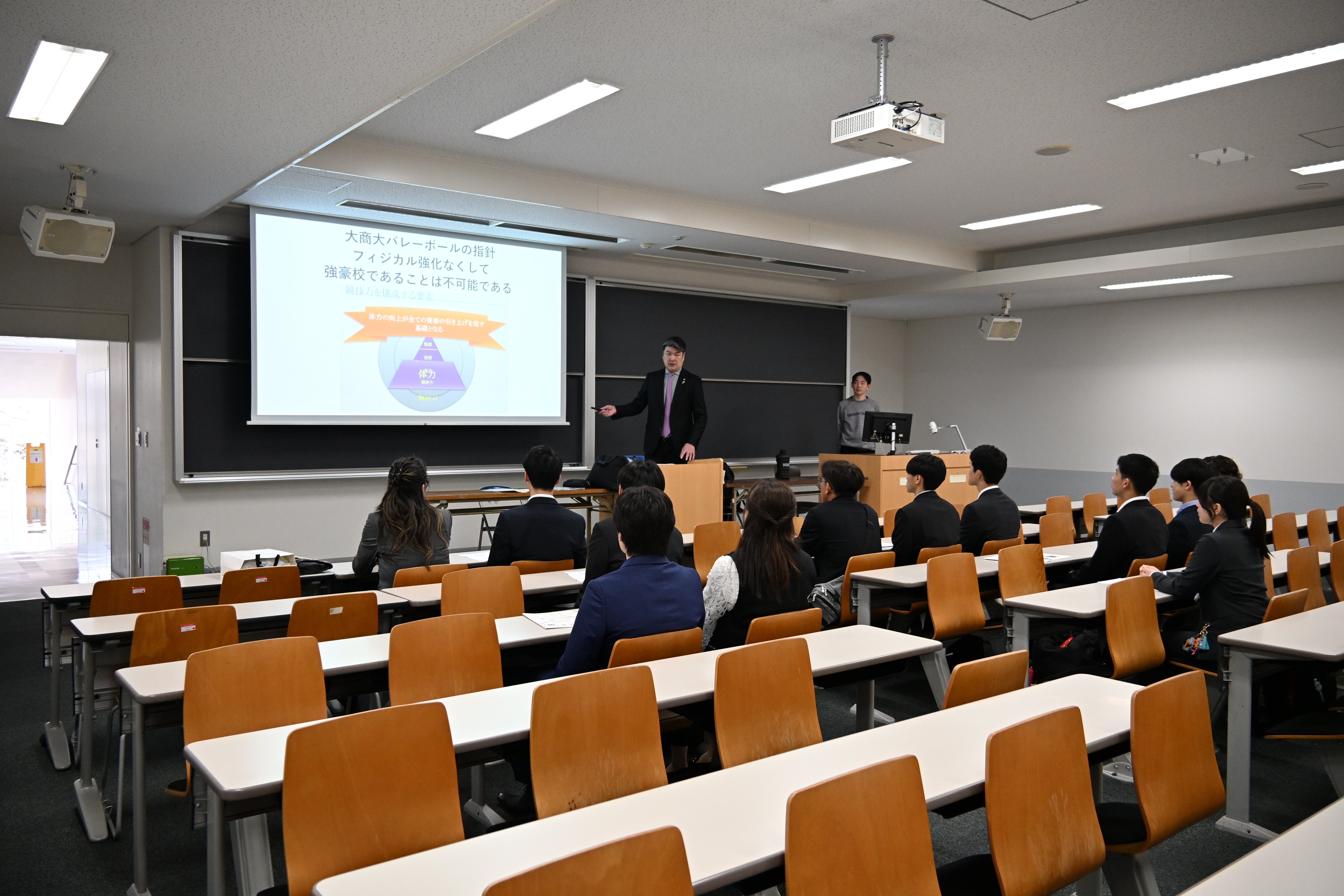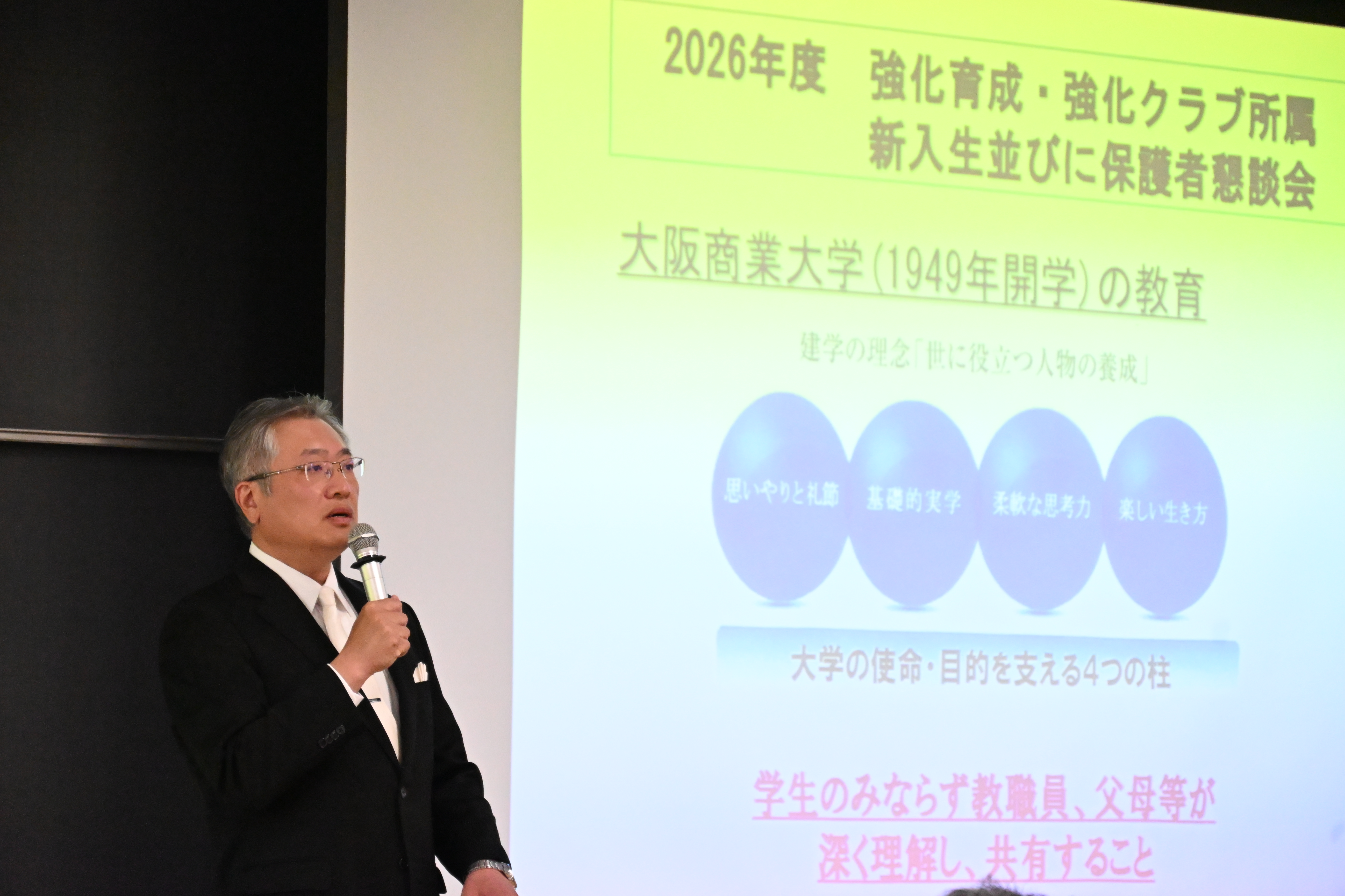 はじめに本学副学長の孫飛舟先生より「大阪商業大学のスポーツ活動について」をお話しいただき、「本学の建学の理念を理解してスポーツ活動と学業とを4年間しっかりと取り組み、人間として大きく成長してほしい」と新入生を鼓舞されました。