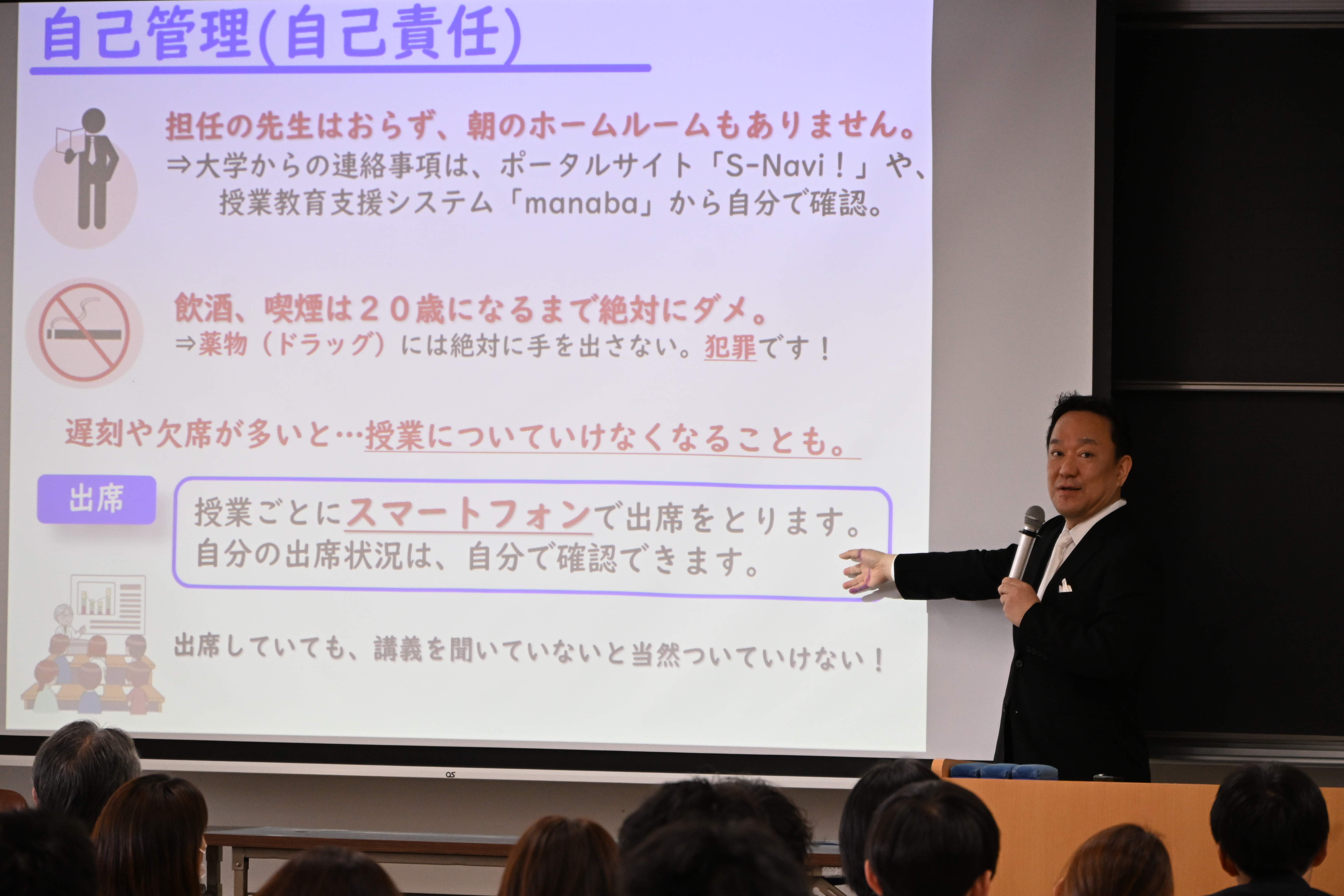 続けて、スポーツ振興審議会会長の林幸治先生より「大阪商業大学での学びについて」をお話しいただきました。大学での自己管理の重要性に加え、新カリキュラムについてや、本学スポーツ憲章について説明され、新入生は真剣に耳を傾けていました。