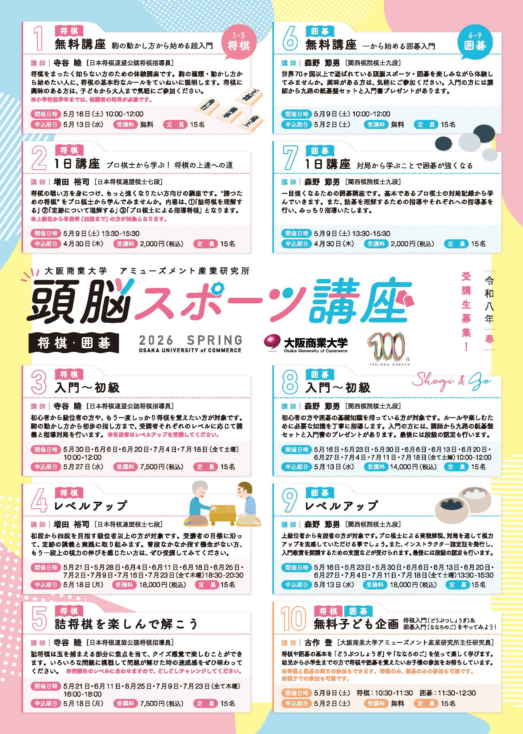 大阪商業大学アミューズメント産業研究所では、研究所と関係諸機関とのネットワークを活かし、囲碁・将棋を楽しみたい方、本格的に囲碁・将棋の棋力を高めたい方のための頭脳スポーツ講座を開講しています。