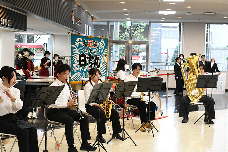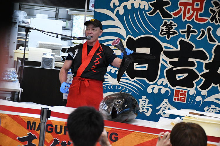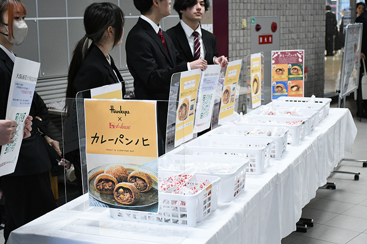 パーティー料理のほか、ハウス食品グループ本社株式会社様から「カレーパン」、アルヘイムフードサービス株式会社様から「大商大バーガー」をご提供いただき、参加者に配布いたしました。また、特別企画として「マグロの解体ショー」を実施し、大きな盛り上がりを見せました。解体されたマグロはその場でお寿司として振る舞われ、参加者の皆さんに大変好評でした。